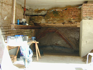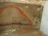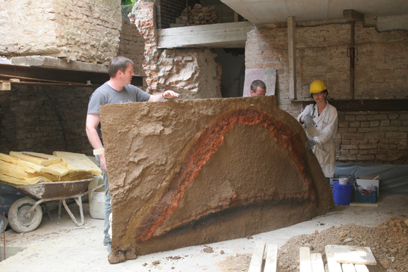 2. Die geputzte Profilwand, zur späteren Entnahme wurden links einige Ziegel entfernt und das ganze während des Arbeitsprozessen mit Eisenträgern, links und über die gesamte Fläche abgefangen.