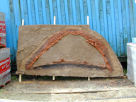 9. Nach dem endgültigen Aushärten des Kunststoffes wurde das Profil abgewaschen, so das alle lockeren Sedimente, die bei der Abnahme immer mitkommen aber überflüssig sind, entfernt wurden. Nun steht es in der Sonne zu Trocknen, nach auf dem provisorischen Tragegestell. Erst nach dem Reinigen zeigen sich die Feinstrukturen, die man an einem geputzem Profil im Gelände niemals sehen würde. Die Großen Scherben die vom Kuppelofen mitgekommen waren wiesen an den Innenseiten sogar die Fingerabdrücke ihres oder Ihrer Hersteller auf.