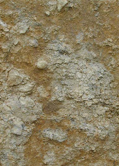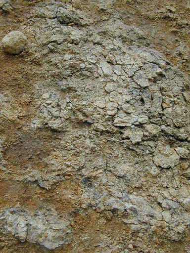 Bonn - Oberkassel, Detail, tonig verwitterter Basalt bildet die Profilbasis.
