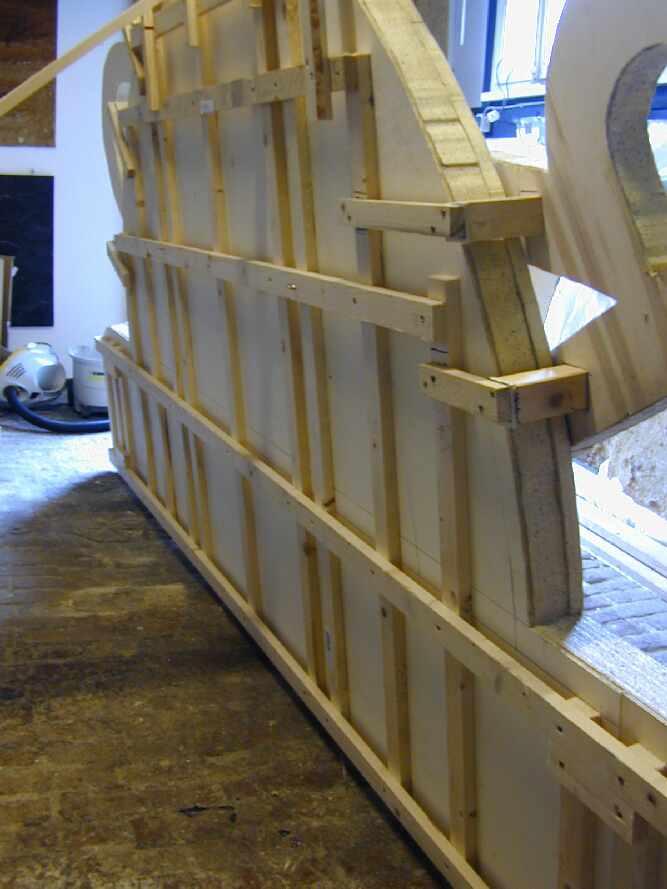 Das Material sollte aus Arbeitstechnischen- und Transportgründen schon recht leicht sein. So entschied ich mich für 4mm und 6mm Sperrholz, das hinten mit einer Dachlattenkonstruktion verschraubt wurde. Das Gestell gab die nötige Stabilität, aber sparte Gewicht.