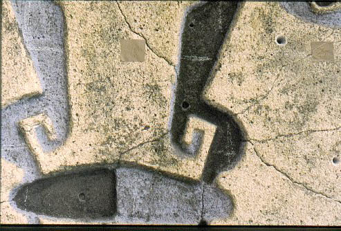 Detailansicht, Risse und Verschmutzung, hier sind auch vier der Bohrlöcher zu
